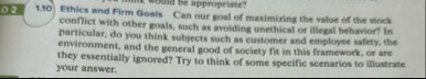 02 1.10 be appropriate? Ethics and Firm Goals Can our goal of maximizing the value of the stock conflict with other goals, such as avoiding unethical or illegal behavion in particular, do you think subjects such as customer and employee safety, the environment, and the general good of society fit in this framework, or are they essentially ignored? Try to think of some specific scenarios to THustrate your answer.