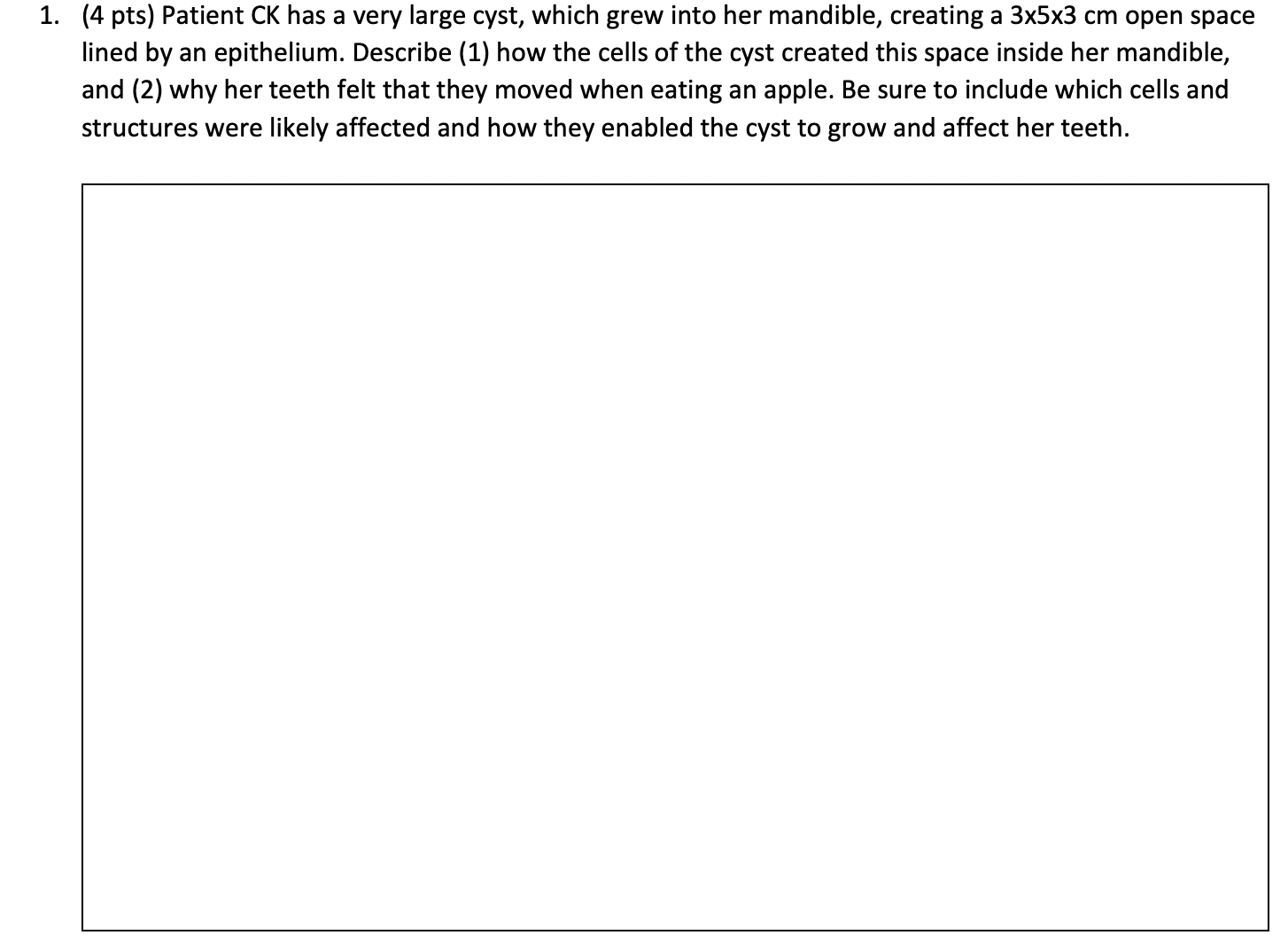 1. (4 pts) Patient CK has a very large cyst, which grew into her mandible, creating a \( 3 \times 5 \times 3 \mathrm{~cm} \) open space lined by an epithelium. Describe (1) how the cells of the cyst created this space inside her mandible, and (2) why her teeth felt that they moved when eating an apple. Be sure to include which cells and structures were likely affected and how they enabled the cyst to grow and affect her teeth.