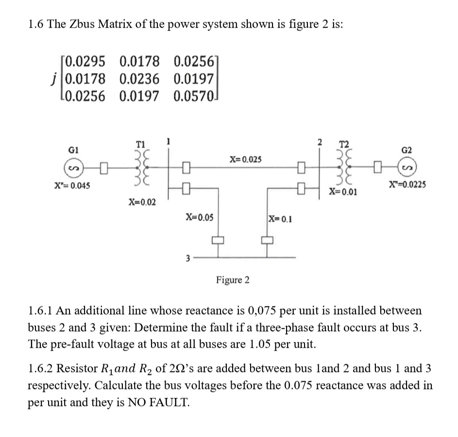 j[[0.0295,0.0178,0.0256],[0.0178,0.0236,0.0197],[0.0256,0.0197,0.0570]]1.6.1 An additional line whose reactance is 0,075 per unit is installed between buses 2 and 3 given: Determine the fault if a three-phase fault occurs at bus 3. The pre-fault voltage at bus at all buses are 1.05 per unit. 1.6.2 Resistor
