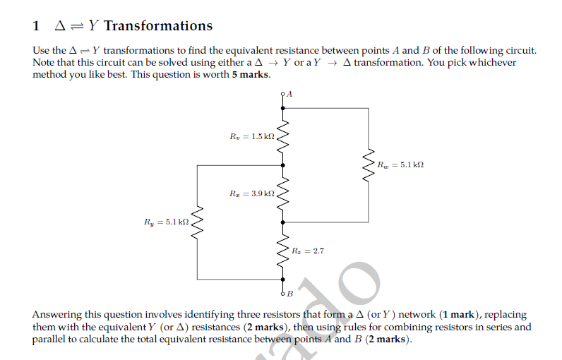 Answering this question involves identifying three resistors that form a \Delta Y 1 markY\Delta A and B2 marks