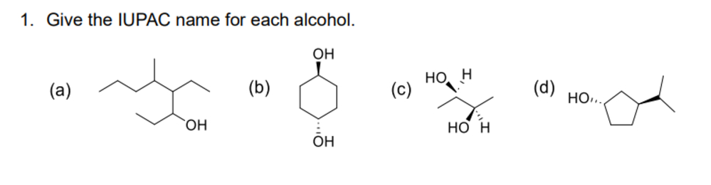 1. Give the IUPAC name for each alcohol. (a) (b) (c) (d)