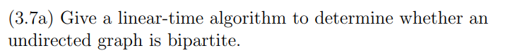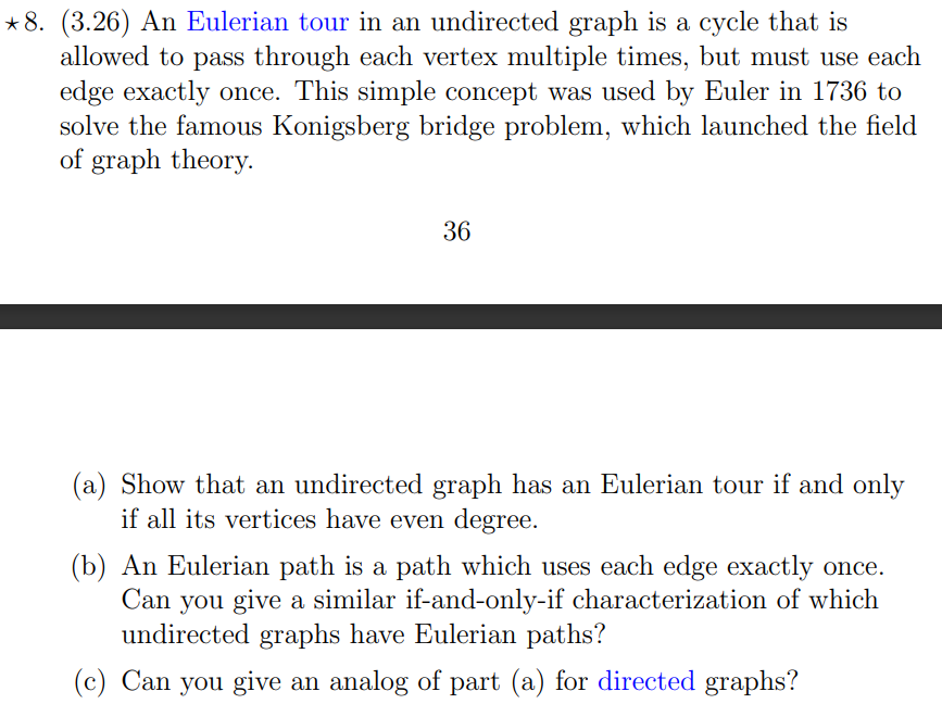 \sum_(uinV) d(u)=2|E|. (b) Use part (a) to show that in an undirected graph, there must be an even number of vertices whose degree is odd. (c) Does a similar statement hold for the number of vertices with odd in-degree in a directed graph? 2.Give a linear-time algorithm to determine whether an undirected graph is bipartite. 3.An Eulerian tour in an undirected graph is a cycle that is allowed to pass through each vertex multiple times, but must use each edge exactly once. This simple concept was used by Euler in 1736 to solve the famous Konigsberg bridge problem, which launched the field of graph theory. (a) Show that an undirected graph has an Eulerian tour if and only if all its vertices have even degree. (b) An Eulerian path is a path which uses each edge exactly once. Can you give a similar if-and-only-if characterization of which undirected graphs have Eulerian paths? (c) Can you give an analog of part (a) for directed graphs?