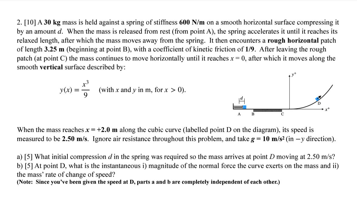 D, what is the instantaneous i) magnitude of the normal force the curve exerts on the mass and ii) the mass' rate of change of speed? (Note: Since you've been given the speed at
