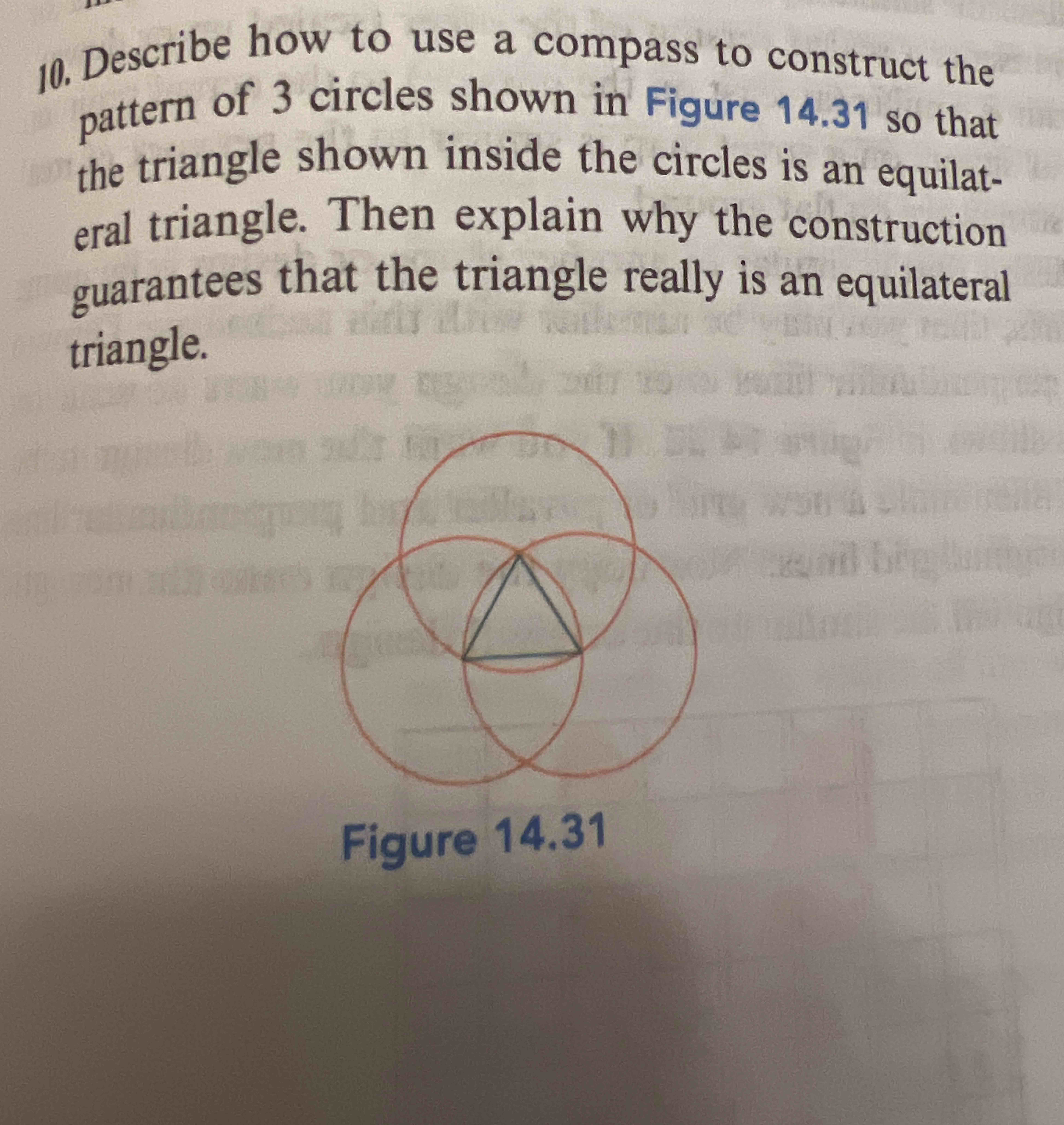 10. Describe how to use a compass to construct the pattern of 3 circles shown in Figure 14.31 so that the triangle shown inside the circles is an equilateral triangle. Then explain why the construction guarantees that the triangle really is an equilateral triangle.