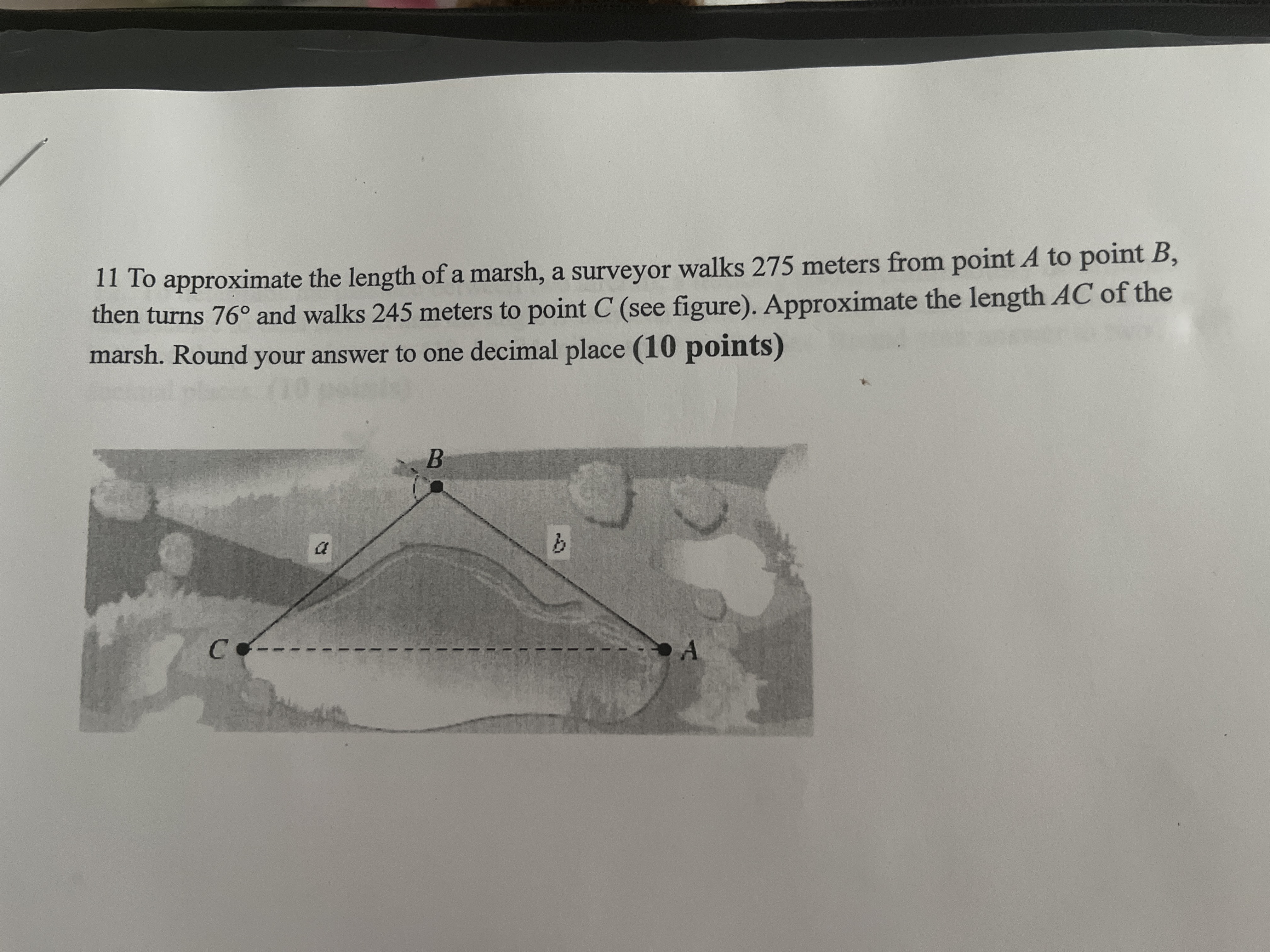 11 To approximate the length of a marsh, a surveyor walks 275 meters from point \( A \) to point \( B \), then turns \( 76^{\circ} \) and walks 245 meters to point \( C \) (see figure). Approximate the length \( A C \) of the marsh. Round your answer to one decimal place (10 points)