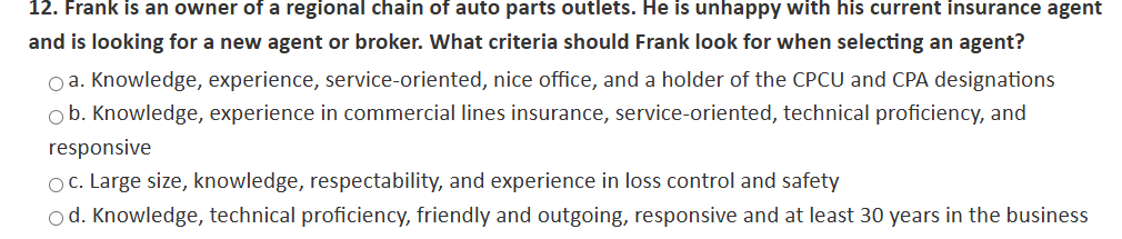 12. Frank is an owner of a regional chain of auto parts outlets. He is unhappy with his current insurance agent and is looking for a new agent or broker. What criteria should Frank look for when selecting an agent? a. Knowledge, experience, service-oriented, nice office, and a holder of the CPCU and CPA designations b. Knowledge, experience in commercial lines insurance, service-oriented, technical proficiency, and responsive c. Large size, knowledge, respectability, and experience in loss control and safety d. Knowledge, technical proficiency, friendly and outgoing, responsive and at least 30 years in the business