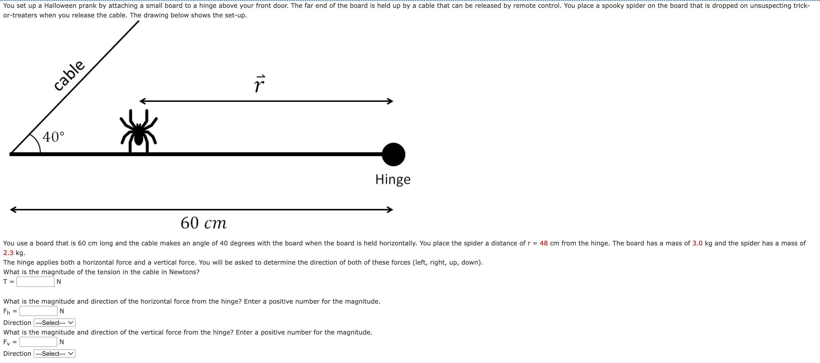 2.3kg. The hinge applies both a horizontal force and a vertical force. You will be asked to determine the direction of both of these forces (left, right, up, down). What is the magnitude of the tension in the cable in Newtons?