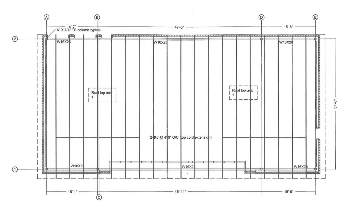 2. Determine the quantity of concrete and reinforcing required for the slab on grade. (Grade Beams included). Hint: Assume that the grade beams have square edges and not inclined. 3. Determine the weight of W-section roof beams as shown in Drawing No.2 at the perimeter of the structure. 4. Determine the weight of the roof joists as shown in Drawing No.2
