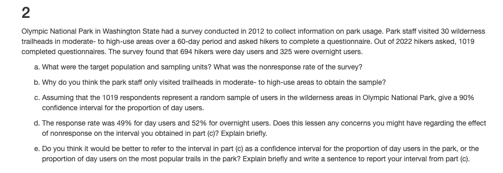 2 Olympic National Park in Washington State had a survey conducted in 2012 to collect information on park usage. Park staff visited 30 wilderness trailheads in moderate- to high-use areas over a 60-day period and asked hikers to complete a questionnaire. Out of 2022 hikers asked, 1019 completed questionnaires. The survey found that 694 hikers were day users and 325 were overnight users. a. What were the target population and sampling units? What was the nonresponse rate of the survey? b. Why do you think the park staff only visited trailheads in moderate- to high-use areas to obtain the sample? c. Assuming that the 1019 respondents represent a random sample of users in the wilderness areas in Olympic National Park, give a \( 90 \% \) confidence interval for the proportion of day users. d. The response rate was \( 49 \% \) for day users and \( 52 \% \) for overnight users. Does this lessen any concerns you might have regarding the effect of nonresponse on the interval you obtained in part (c)? Explain briefly. e. Do you think it would be better to refer to the interval in part (c) as a confidence interval for the proportion of day users in the park, or the proportion of day users on the most popular trails in the park? Explain briefly and write a sentence to report your interval from part (c).