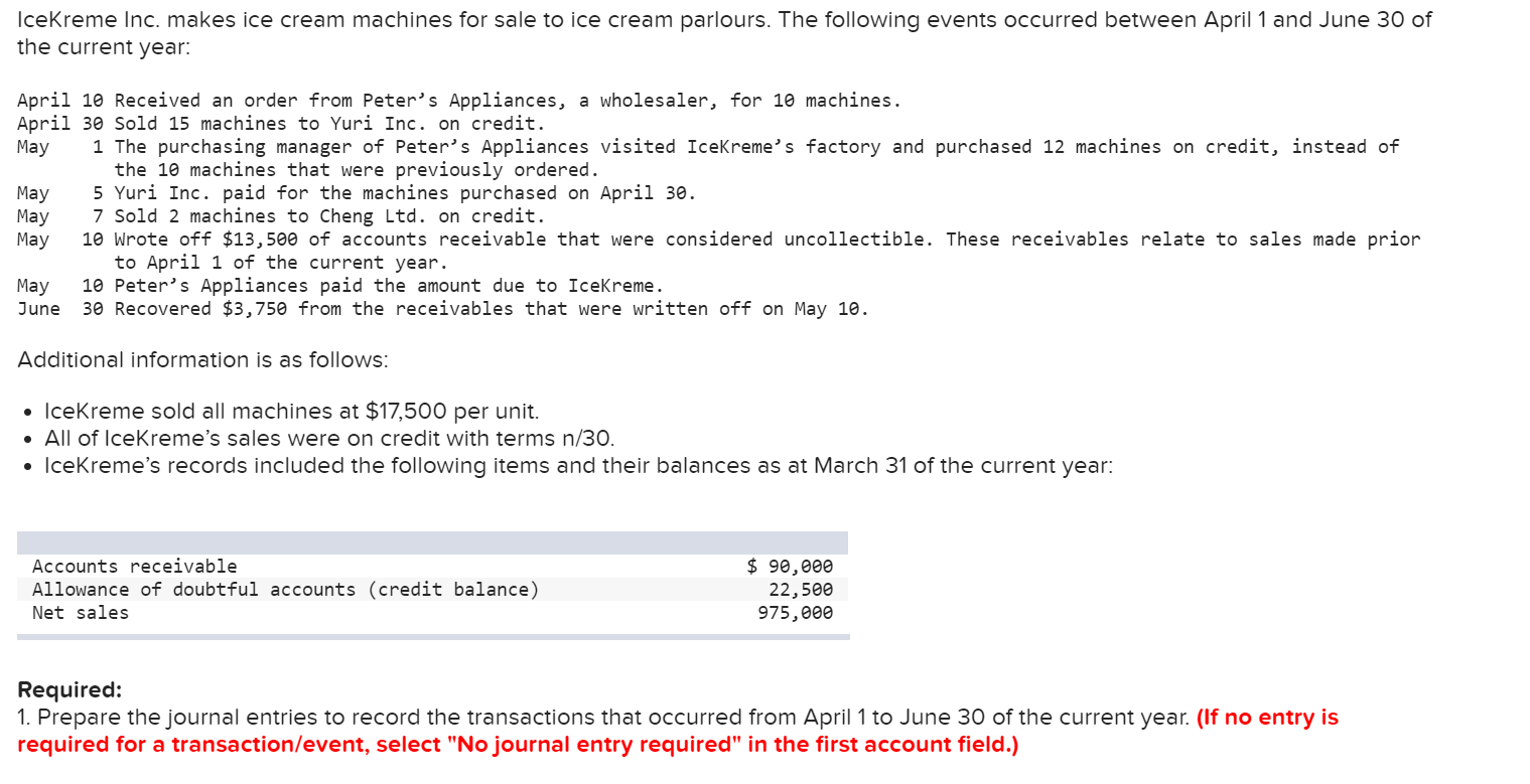 IceKreme Inc. makes ice cream machines for sale to ice cream parlours. The following events occurred between April 1 and June 30 of the current year: April 10 Received an order from Peter's Appliances, a wholesaler, for 10 machines. April 30 Sold 15 machines to Yuri Inc. on credit. May 1 The purchasing manager of Peter's Appliances visited Icekreme's factory and purchased 12 machines on credit, instead of the 10 machines that were previously ordered. May 5 Yuri Inc. paid for the machines purchased on April 30. May 7 sold 2 machines to Cheng Ltd. on credit. May 10 Wrote off $13,500 of accounts receivable that were considered uncollectible. These receivables relate to sales made prior to April 1 of the current year. May 10 Peter's Appliances paid the amount due to IceKreme. June 30 Recovered $3,750 from the receivables that were written off on May 10 . Additional information is as follows: - IceKreme sold all machines at \$17,500 per unit. - All of IceKreme's sales were on credit with terms n/30. - IceKreme's records included the following items and their balances as at March 31 of the current year: Required: 1. Prepare the journal entries to record the transactions that occurred from April 1 to June 30 of the current year. (If no entry is required for a transaction/event, select "No journal entry required" in the first account field.)