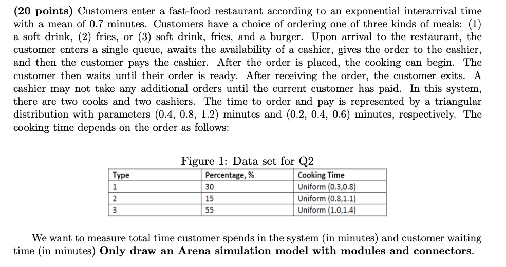 (20 points) Customers enter a fast-food restaurant according to an exponential interarrival time with a mean of 0.7 minutes. Customers have a choice of ordering one of three kinds of meals: (1) a soft drink, (2) fries, or (3) soft drink, fries, and a burger. Upon arrival to the restaurant, the customer enters a single queue, awaits the availability of a cashier, gives the order to the cashier, and then the customer pays the cashier. After the order is placed, the cooking can begin. The customer then waits until their order is ready. After receiving the order, the customer exits. A cashier may not take any additional orders until the current customer has paid. In this system, there are two cooks and two cashiers. The time to order and pay is represented by a triangular distribution with parameters ( \( 0.4,0.8,1.2 \) ) minutes and ( \( 0.2,0.4,0.6 \) ) minutes, respectively. The cooking time depends on the order as follows: We want to measure total time customer spends in the system (in minutes) and customer waiting time (in minutes) Only draw an Arena simulation model with modules and connectors.