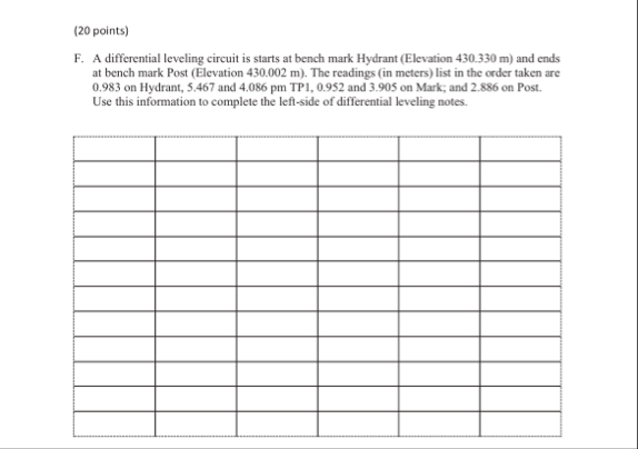 (20 points) F. A differential leveling circuit is starts at bench mark Hydrant (Elevation 430.330 m ) and ends at bench mark Post (Elevation 430.002 m ). The readings (in meters) list in the order taken are 0.983 on Hydrant, 5.467 and 4.086 pm TP1, 0.952 and 3.905 on Mark; and 2.886 on Post. Use this information to complete the left-side of differential leveling notes. \table[[,,,,,],[,,,,,],[,,,,,],[,,,,,],[,,,,,],[,,,,,],[,,,,,],[,,,,,],[,,,,,],[,,,,,],[,,,,,]]