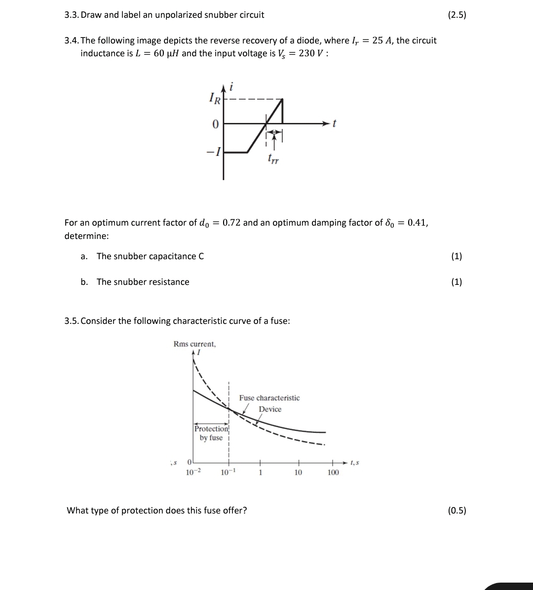 3.3. Draw and label an unpolarized snubber circuit (2.5) 3.4. The following image depicts the reverse recovery of a diode, where