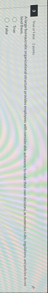 A large bureaucratic organizational structure provides employees with considerable autonomy to make their own decisions, as numerous rules, regulations, and policies do not bind them.