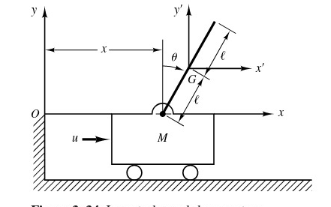 "Referring to Examples 3–5 and 3–6, consider the inverted-pendulum system shown in Figure 3–34. Assume that the mass of the inverted pendulum is m and is evenly distributed along the length of the rod. (The center of gravity of the pendulum is located at the center of the rod.)Assuming that u is small, derive mathematical models for the system in the forms of differential equations, transfer functions, and state-space equations"