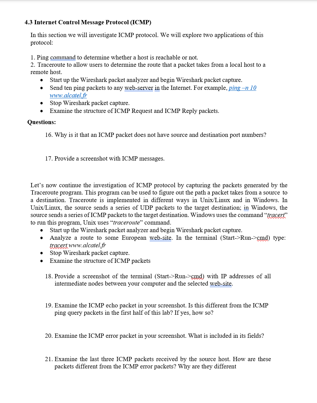 4.3 Internet Control Message Protocol (ICMP) In this section we will investigate ICMP protocol. We will explore two applications of this protocol: 1. Ping command to determine whether a host is reachable or not. 2. Traceroute to allow users to determine the route that a packet takes from a local host to a remote host. - Start up the Wireshark packet analyzer and begin Wireshark packet capture. - Send ten ping packets to any web-server in the Internet. For example, ping-n 10 www.alcatel,fr - Stop Wireshark packet capture. - Examine the structure of ICMP Request and ICMP Reply packets. Questions: 16. Why is it that an ICMP packet does not have source and destination port numbers? 17. Provide a screenshot with ICMP messages. Let's now continue the investigation of ICMP protocol by capturing the packets generated by the Traceroute program. This program can be used to figure out the path a packet takes from a source to a destination. Traceroute is implemented in different ways in Unix/Linux and in Windows. In Unix/Linux, the source sends a series of UDP packets to the target destination; in Windows, the source sends a series of ICMP packets to the target destination. Windows uses the command "tracert" to run this program, Unix uses "traceroute" command. - Start up the Wireshark packet analyzer and begin Wireshark packet capture. - Analyze a route to some European web-site. In the terminal (Start->Run->cmd) type: tracert www.alcatel.fr - Stop Wireshark packet capture. - Examine the structure of ICMP packets 18. Provide a screenshot of the terminal (Start->Run->cmd) with IP addresses of all intermediate nodes between your computer and the selected web-site. 19. Examine the ICMP echo packet in your screenshot. Is this different from the ICMP ping query packets in the first half of this lab? If yes, how so? 20. Examine the ICMP error packet in your screenshot. What is included in its fields? 21. Examine the last three ICMP packets received by the source host. How are these packets different from the ICMP error packets? Why are they different