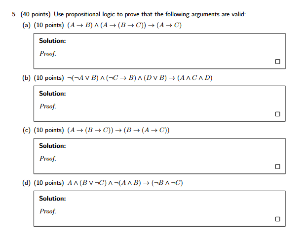 (40 points) Use propositional logic to prove that the following arguments are valid