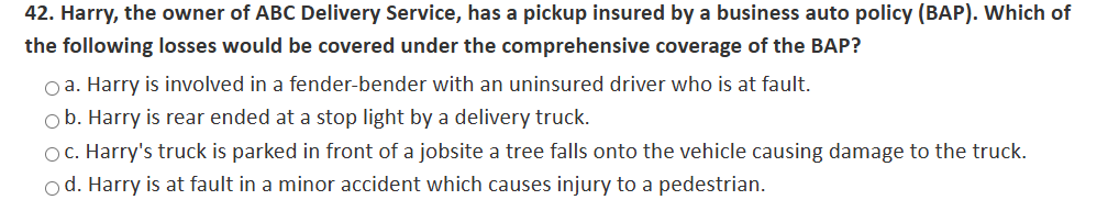 42. Harry, the owner of ABC Delivery Service, has a pickup insured by a business auto policy (BAP). Which of the following losses would be covered under the comprehensive coverage of the BAP? a. Harry is involved in a fender-bender with an uninsured driver who is at fault. b. Harry is rear ended at a stop light by a delivery truck. c. Harry's truck is parked in front of a jobsite a tree falls onto the vehicle causing damage to the truck. d. Harry is at fault in a minor accident which causes injury to a pedestrian.