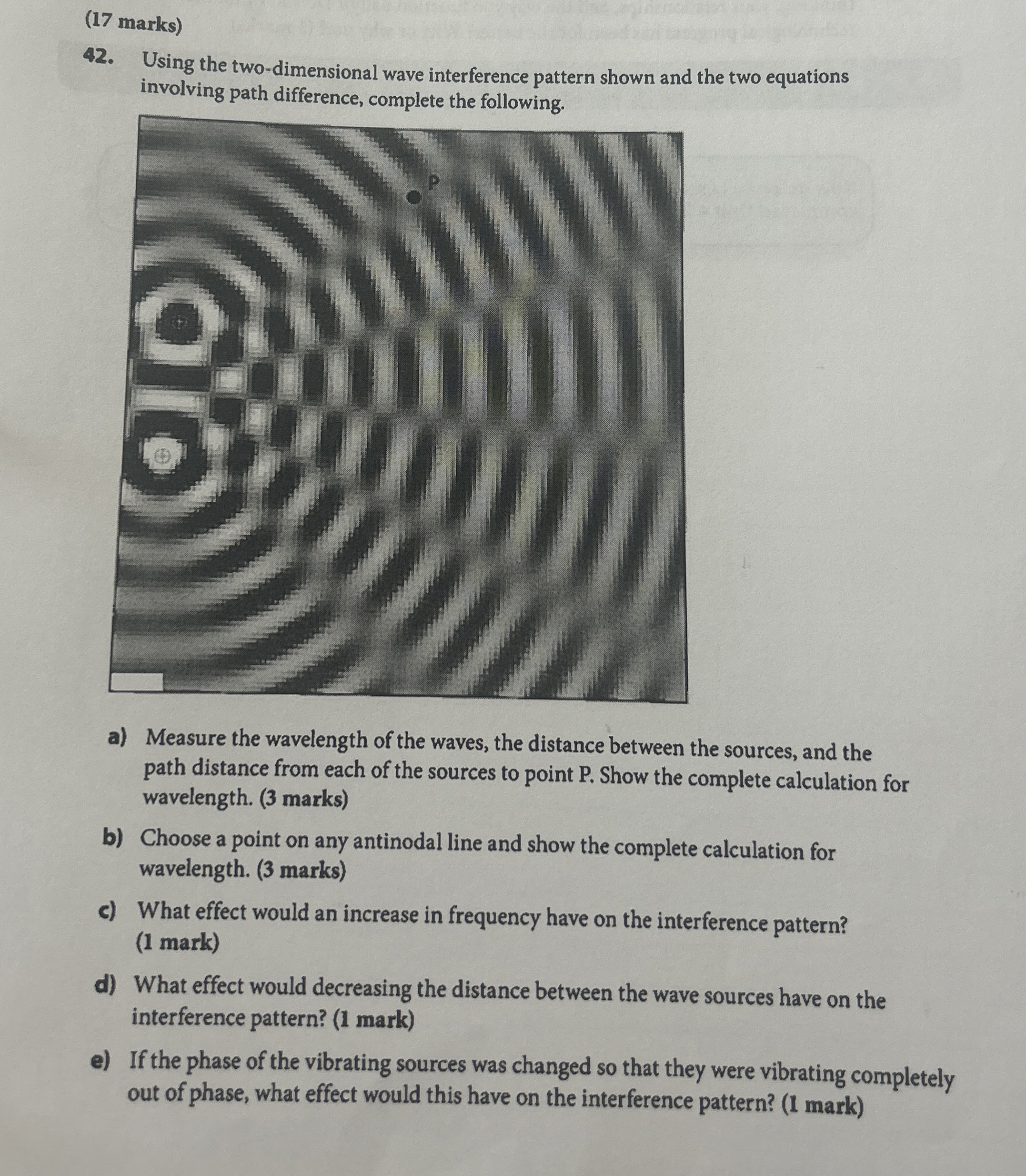 . Show the complete calculation for wavelength. (3 marks) b) Choose a point on any antinodal line and show the complete calculation for wavelength. ( 3 marks) c) What effect would an increase in frequency have on the interference pattern? (1 mark) d) What effect would decreasing the distance between the wave sources have on the interference pattern? ( 1 mark) e) If the phase of the vibrating sources was changed so that they were vibrating completely out of phase, what effect would this have on the interference pattern? ( 1 mark)