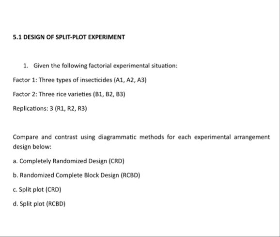 5.1 DESIGN OF SPLIT-PLOT EXPERIMENT Given the following factorial experimental situation: Factor 1: Three types of insecticides (A1, A2, A3) Factor 2: Three rice varieties (B1, B2, B3) Replications: 3 (R1, R2, R3) Compare and contrast using diagrammatic methods for each experimental arrangement design below: a. Completely Randomized Design (CRD) b. Randomized Complete Block Design (RCBD) c. Split plot (CRD) d. Split plot (RCBD)