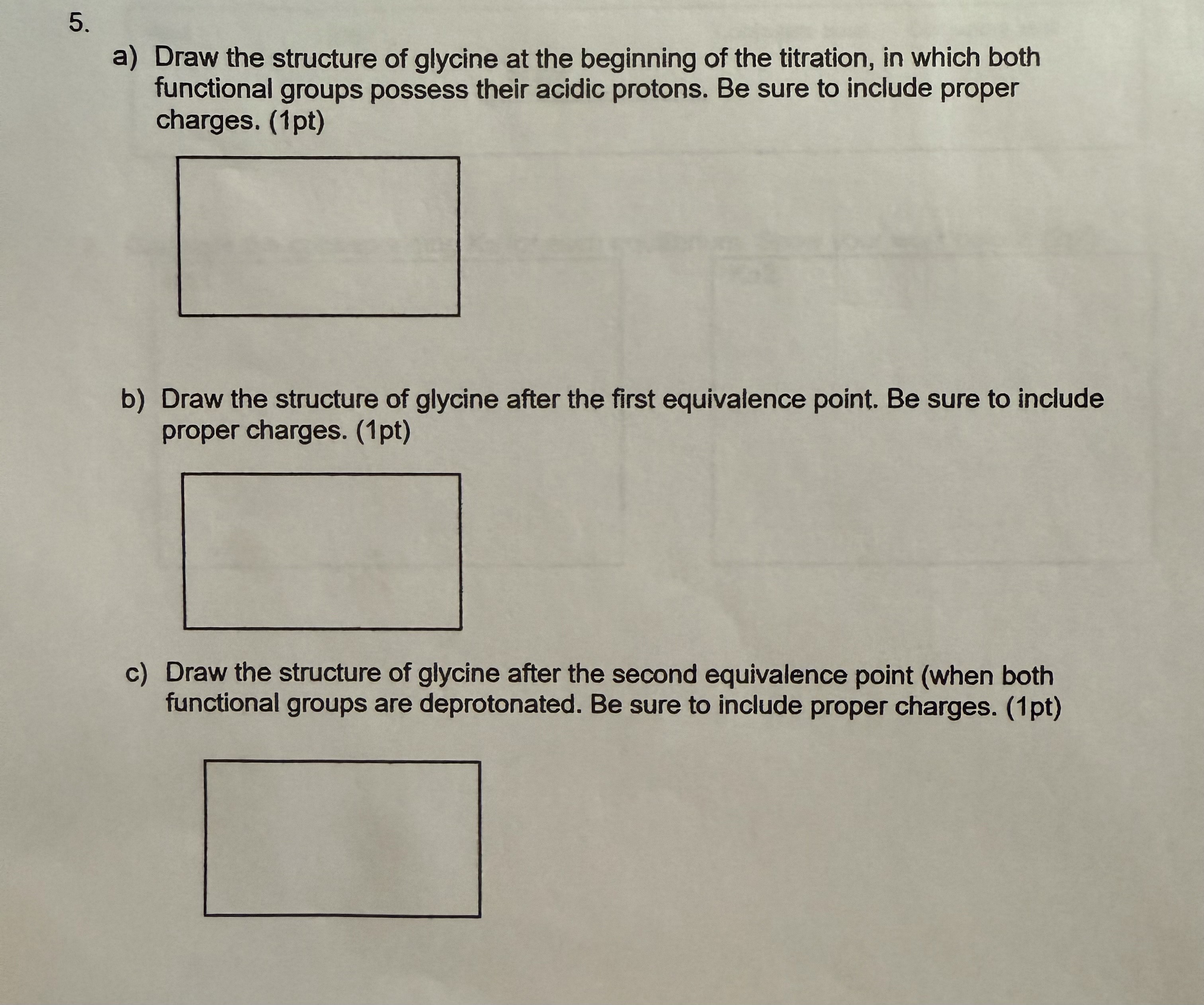 5. a) Draw the structure of glycine at the beginning of the titration, in which both functional groups possess their acidic protons. Be sure to include proper charges. (1pt) b) Draw the structure of glycine after the first equivalence point. Be sure to include proper charges. (1pt) c) Draw the structure of glycine after the second equivalence point (when both functional groups are deprotonated. Be sure to include proper charges. (1pt)