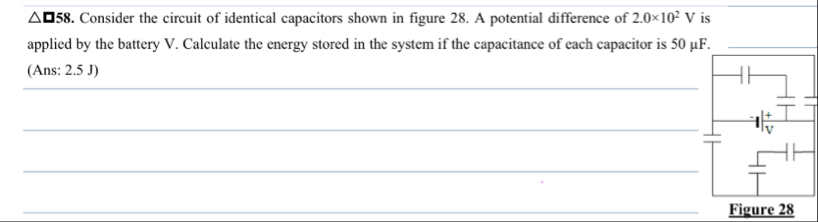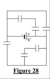 /_(/)58. Consider the circuit of identical capacitors shown in figure 28. A potential difference of