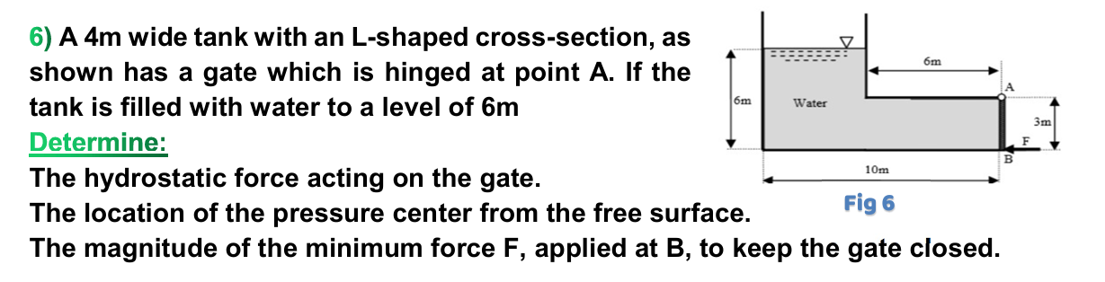 6) A 4 m wide tank with an L-shaped cross-section, as shown has a gate which is hinged at point \( A \). If the tank is filled with water to a level of 6 m Determine: The hydrostatic force acting on the gate. The location of the pressure center from the free surface. The magnitude of the minimum force \( F \), applied at \( B \), to keep the gate closed.