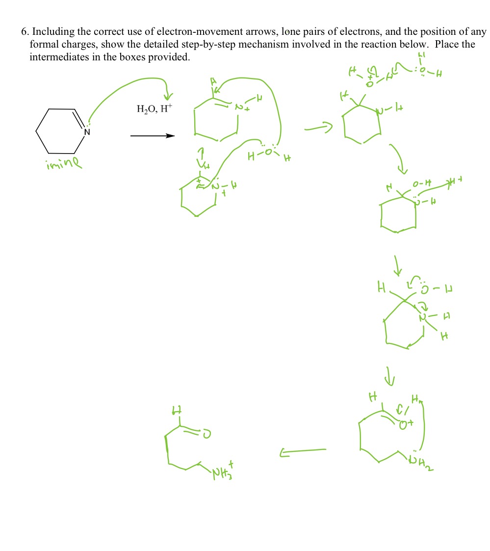 6. Including the correct use of electron-movement arrows, lone pairs of electrons, and the position of any formal charges, show the detailed step-by-step mechanism involved in the reaction below. Place the intermediates in the boxes provided. \[ \longleftarrow \]