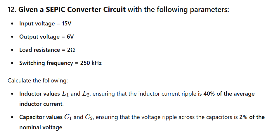 (7-12)Given a SEPIC Converter Circuit with the following parameters: