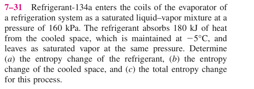 -5\deg C, and leaves as saturated vapor at the same pressure. Determine (a) the entropy change of the refrigerant, (b) the entropy change of the cooled space, and (c) the total entropy change for this process.