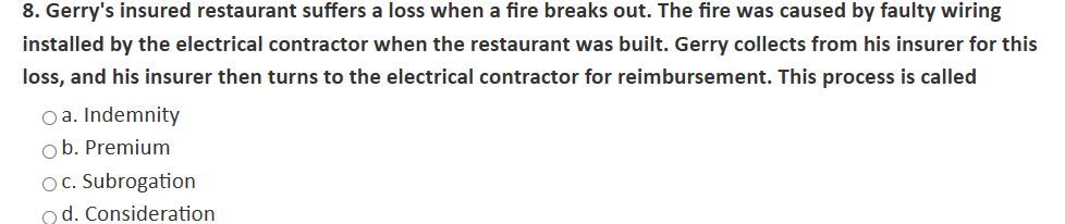 8. Gerry's insured restaurant suffers a loss when a fire breaks out. The fire was caused by faulty wiring installed by the electrical contractor when the restaurant was built. Gerry collects from his insurer for this loss, and his insurer then turns to the electrical contractor for reimbursement. This process is called a. Indemnity b. Premium c. Subrogation d. Consideration
