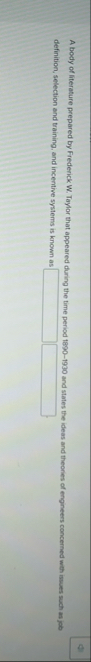 A body of fiterature prepared by Frederick. W. Taylor that appeared during the time period 1890-1930 and states the ideas and theories of engineers concerned with isuses such as ipb definition, selection and training, and incentive systems is known as