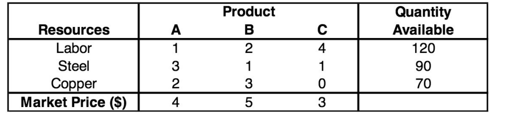 A company manufacturers three products: A, B, and C. The production of these products required three basic resources labor, steel, and copper in the proportions described in the following table. The last row in the table /market price) presents the unit price of the products. The company wants to maximize their sales. The company has tolerances for their resources. The tolerances are 10% for labor, 15% for steel and 5% for copper. The lower bound and upper bounds of the objective function are 175.667 and 188.75, respectively. Write the required fuzzy model using Zimmermann approach