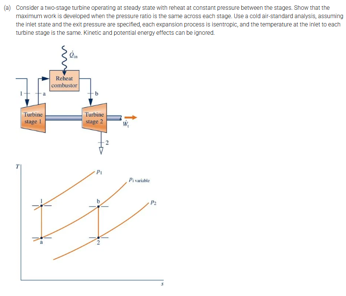 (a) Consider a two-stage turbine operating at steady state with reheat at constant pressure between the stages. Show that the