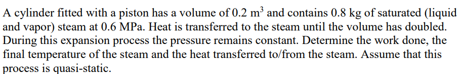 A cylinder fitted with a piston has a volume of \( 0.2 \mathrm{~m}^{3} \) and contains 0.8 kg of saturated (liquid and vapor) steam at 0.6 MPa . Heat is transferred to the steam until the volume has doubled. During this expansion process the pressure remains constant. Determine the work done, the final temperature of the steam and the heat transferred to/from the steam. Assume that this process is quasi-static.