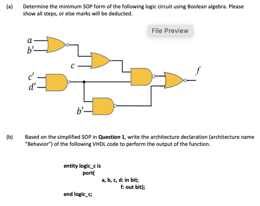 (a) Determine the minimum SOP form of the following logic circuit using Boolean algebra. Please show all steps, or else marks will be deducted.