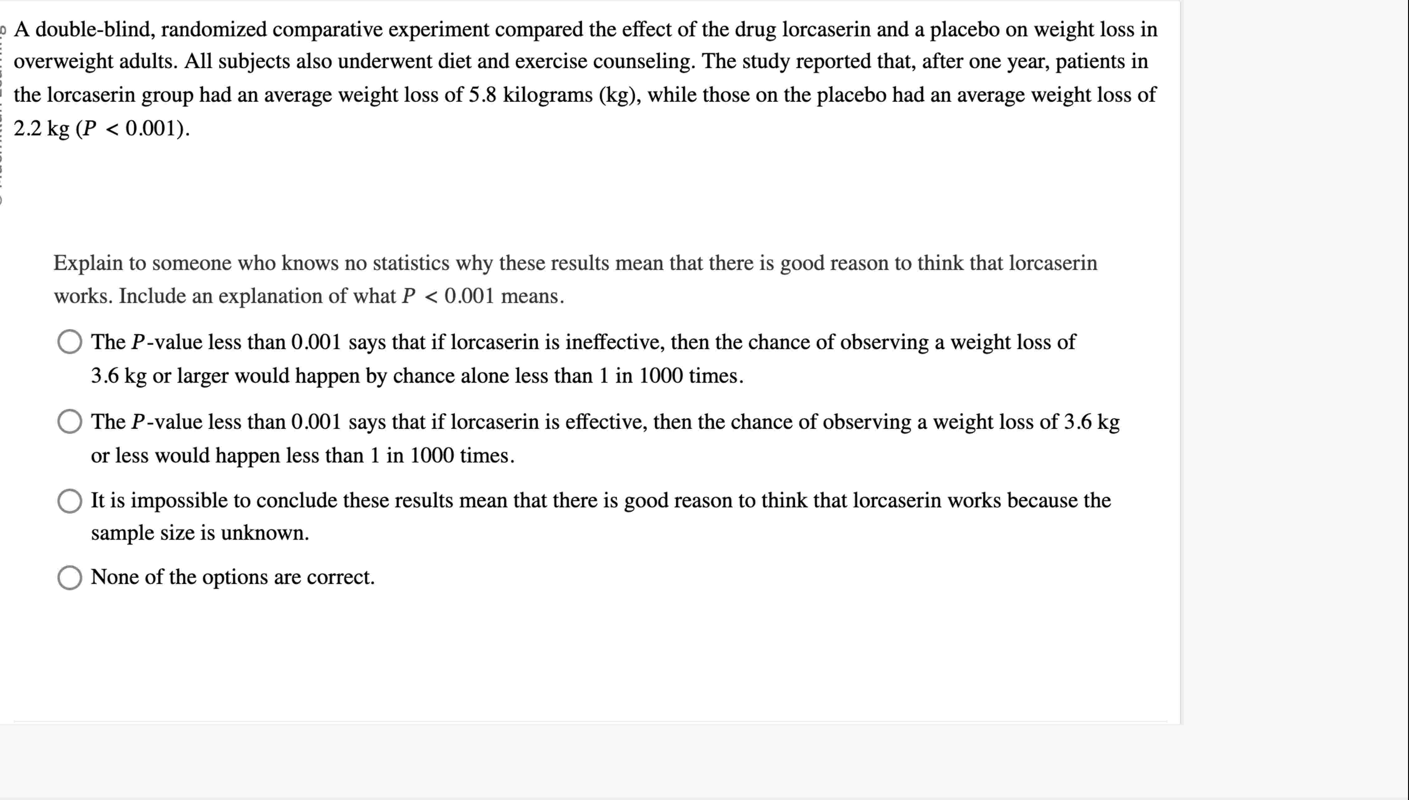 A double-blind, randomized comparative experiment compared the effect of the drug lorcaserin and a placebo on weight loss in overweight adults. All subjects also underwent diet and exercise counseling. The study reported that, after one year, patients in the lorcaserin group had an average weight loss of 5.8 kilograms \( (\mathrm{kg}) \), while those on the placebo had an average weight loss of \( 2.2 \mathrm{~kg}(P<0.001) \). Explain to someone who knows no statistics why these results mean that there is good reason to think that lorcaserin works. Include an explanation of what \( P<0.001 \) means. The \( P \)-value less than 0.001 says that if lorcaserin is ineffective, then the chance of observing a weight loss of 3.6 kg or larger would happen by chance alone less than 1 in 1000 times. The \( P \)-value less than 0.001 says that if lorcaserin is effective, then the chance of observing a weight loss of 3.6 kg or less would happen less than 1 in 1000 times. It is impossible to conclude these results mean that there is good reason to think that lorcaserin works because the sample size is unknown. None of the options are correct.