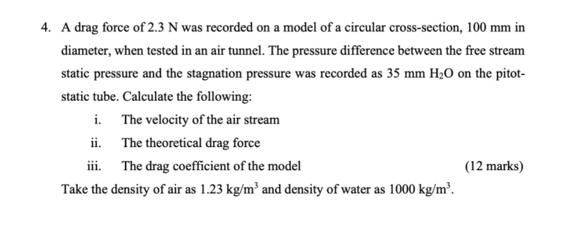 iii. The drag coefficient of the model A drag force of 2.3 N was recorded on a model of a circular cross-section, 100 mm in