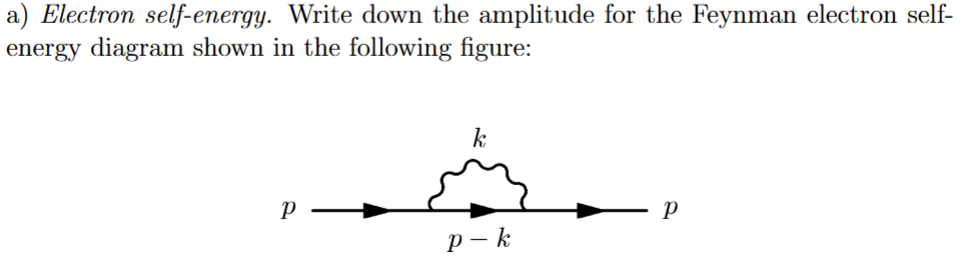 a) Electron self-energy. Write down the amplitude for the Feynman electron selfenergy diagram shown in the following figure: