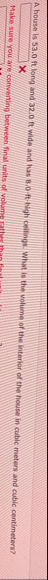 A house is 53.0 ft long and 32.0 ft wide and has B.0-ft-high ceilings. What is the volume of the interior of the house in cubic meters and cubic centimeters?