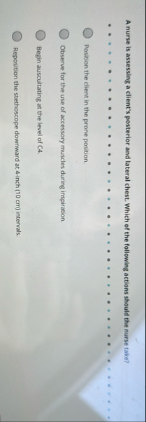 A nurse is assessing a client's posterior and lateral chest. Which of the following actions should the nurse take? Position the client in the prone position. Observe for the use of accessory muscles during inspiration. Begin auscultating at the level of C4. Reposition the stethoscope downward at 4 -inch ( 10 cm ) intervals.