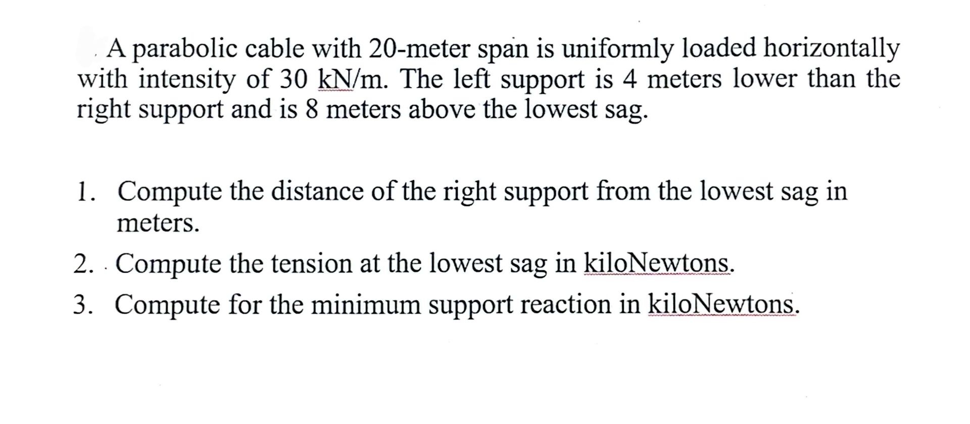 A parabolic cable with 20 -meter span is uniformly loaded horizontally with intensity of