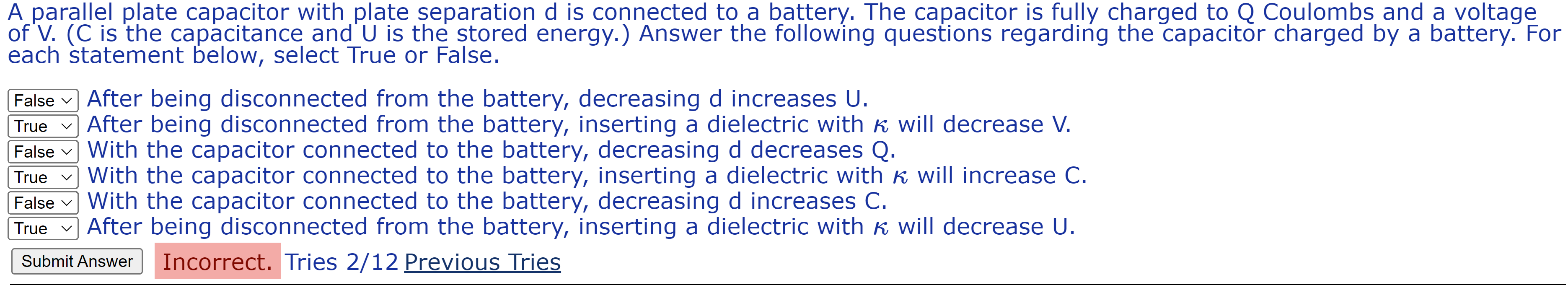 Uis the stored energy.) Answer the following questions regarding the capacitor charged by a battery. For each statement below, select True or False.