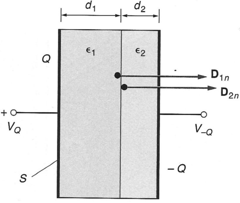A parallel-plate capacitor with plates of area S=100 cm^2 has a two-layer dielectric, as shown in figure below. Dielectric 1 is of thickness d1=1cm and has a relative permittivity of 3 and a dielectric strength five times that of air. The other layer (dielectric 2) is air, of thickness d2=0.5cm. Dielectric strength of air is 3 MV/m. What is the voltage across the whole capacitor that causes the breakdown? At breakdown, what is the voltage across the air layer only?