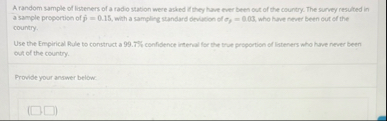 A random sample of listeners of a radio station were asked it they have ever been out of the country. The survey resulted in country. Use the Empirical Rule to construct a