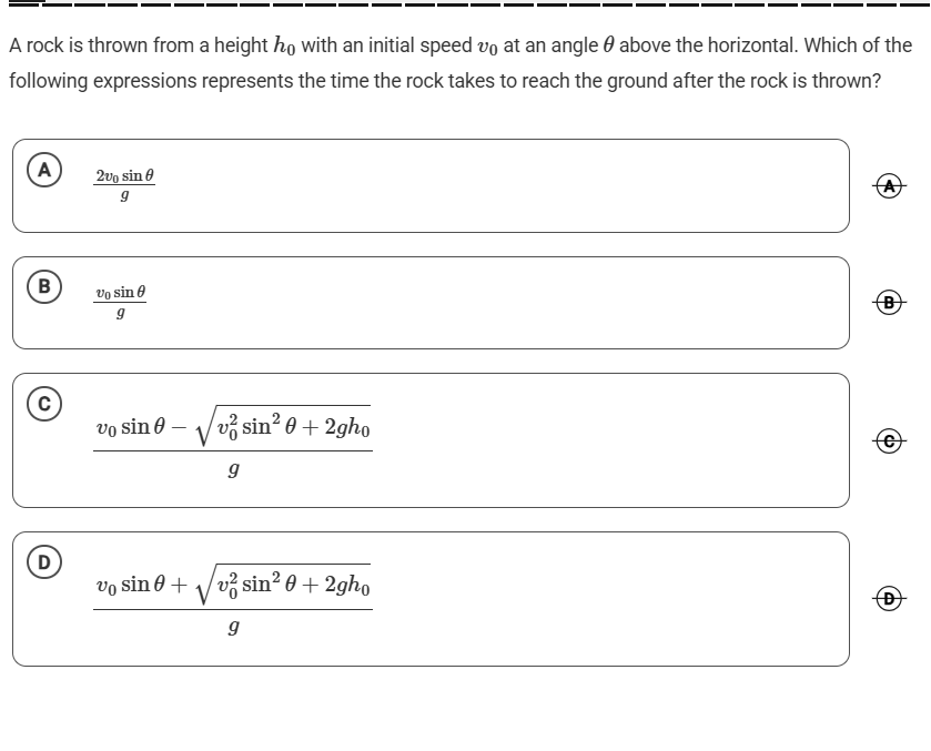 A rock is thrown from a height h_(0) with an initial speed v_(0) at an angle \theta above the horizontal. Which of the