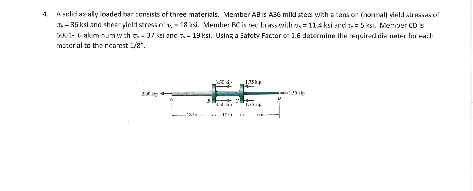 A solid axially loaded bar consists of three materials. Member AB is A36 mild steel with a tension (normal) yield stresses of