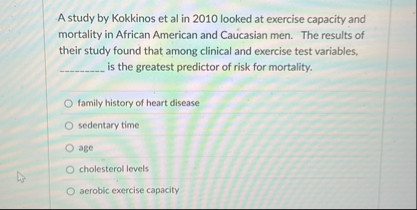 A study by Kokkinos et al in 2010 looked at exercise capacity and mortality in African American and Caucasian men. The results of their study found that among clinical and exercise test variables,