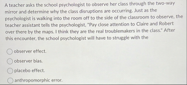 A teacher asks the school psychologist to observe her class through the two-way mirror and determine why the class disruptions are occurring. Just as the psychologist is walking into the room off to the side of the classroom to observe, the teacher assistant tells the psychologist, "Pay close attention to Claire and Robert over there by the maps. I think they are the real troublemakers in the class." After this encounter, the school psychologist will have to struggle with the
