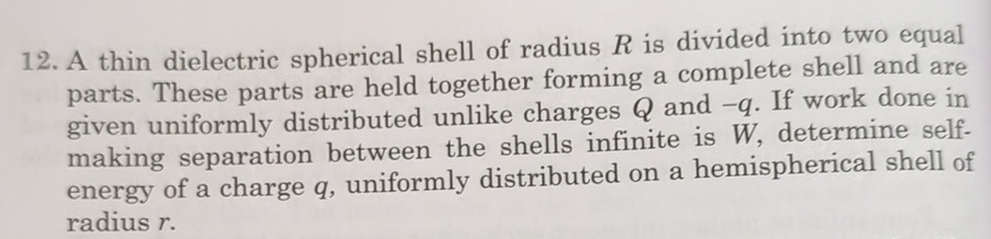 Ris divided into two equal parts. These parts are held together forming a complete shell and are given uniformly distributed unlike charges